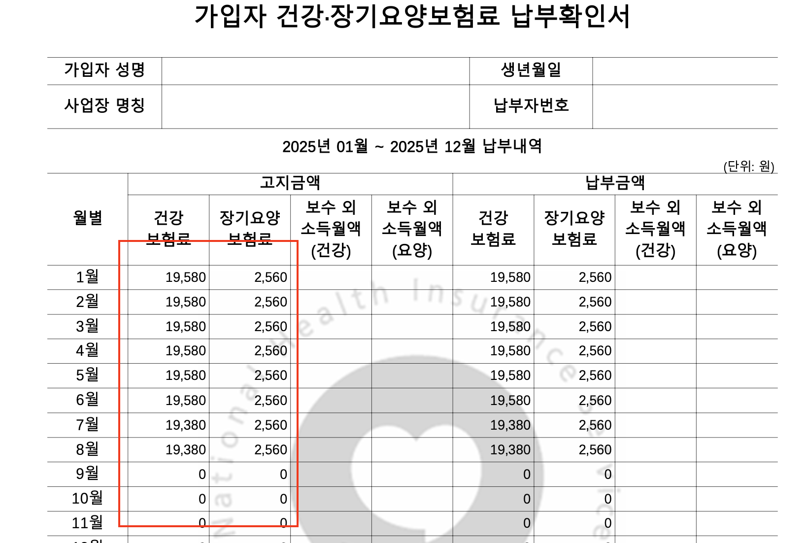 - 최근 건강보험료 부과내역 (본인 부담분, 장기요양보험료 제외 여부 확인)