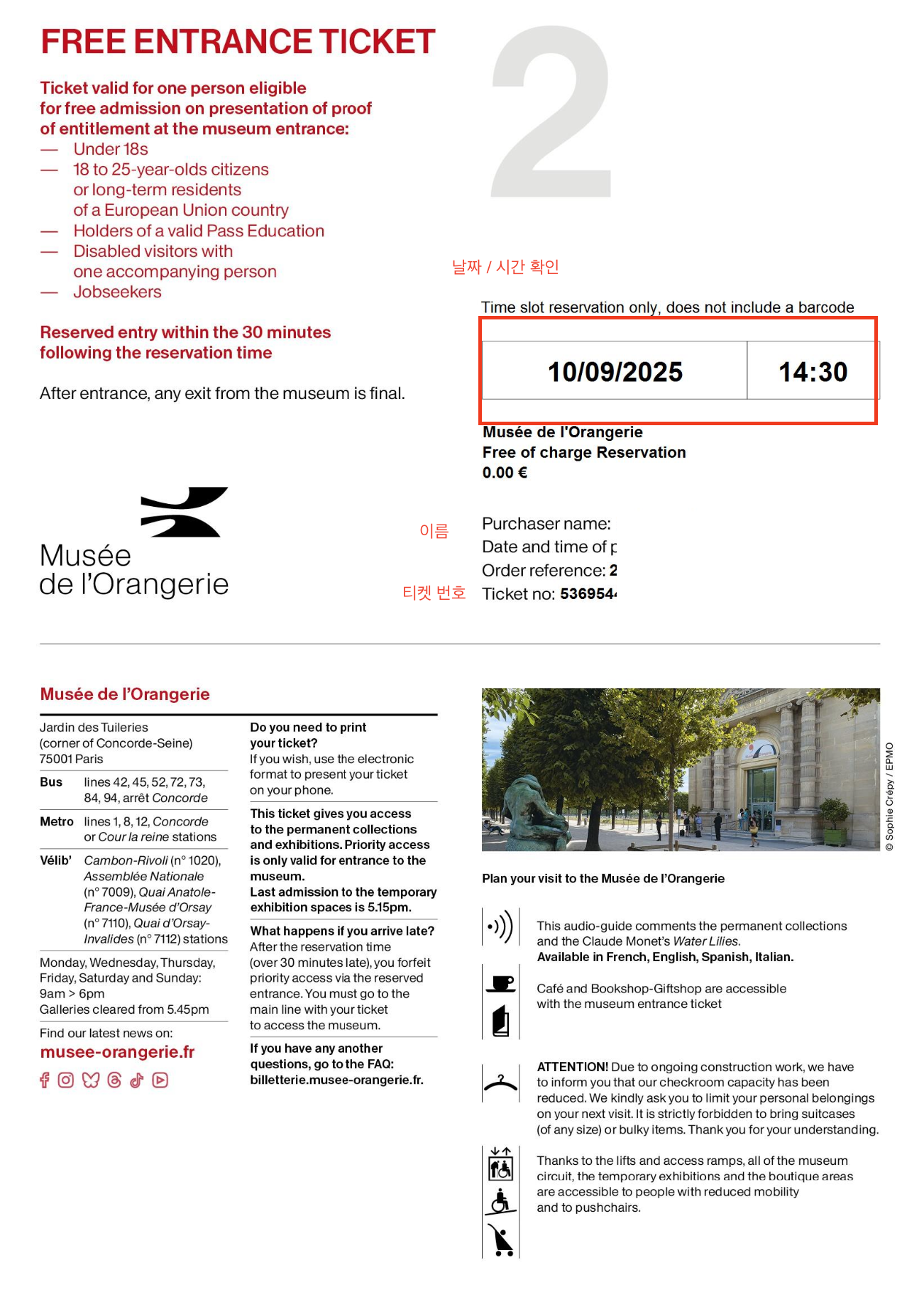 - 일반적으로 오랑주리 공식 사이트에서 예약한 티켓은 환불 및 변경이 불가합니다.