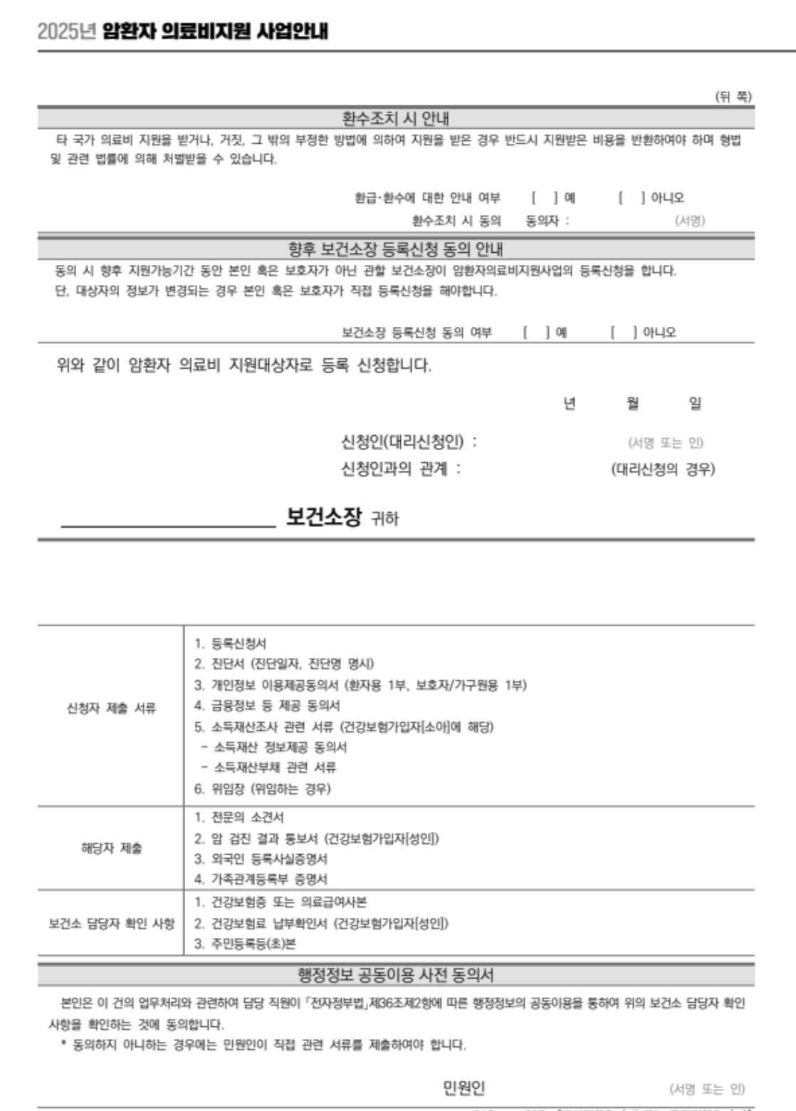 암은 환자 본인뿐 아니라 가족에게도 큰 부담이 되는 질환입니다. 하지만 정부와 지자체의 다양한 의료비 지원 제도를 적극적으로 활용한다면 경제적 부담을 크게 줄일 수 있습니다. 본인이 대상자가 되는지, 어떤 제도를 활용할 수 있는지 꼼꼼히 확인하시고, 필요한 경우 보건소와 국민건강보험공단에 문의하여 빠르게 신청해보시기 바랍니다.